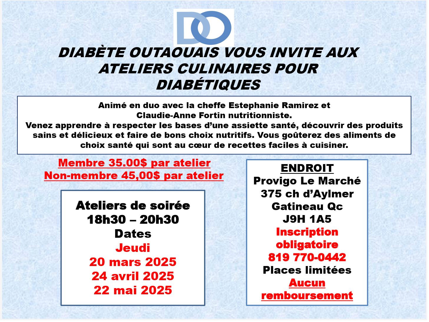 Diabète Outaouais vous invite aux ateliers culinaires pour diabétiques qui se tien ce printemps. Ces activités très populaires sont de retour! Venez apprendre à respecter les bases d’une assiette santé, découvrir des produits sains et délicieux et faire de bons choix nutritifs. Vous goûterez des aliments qui sont des choix santé et qui sont au cœur de recettes faciles à cuisiner. Les places sont limitées, contactez nous pour vous inscrire rapidement !